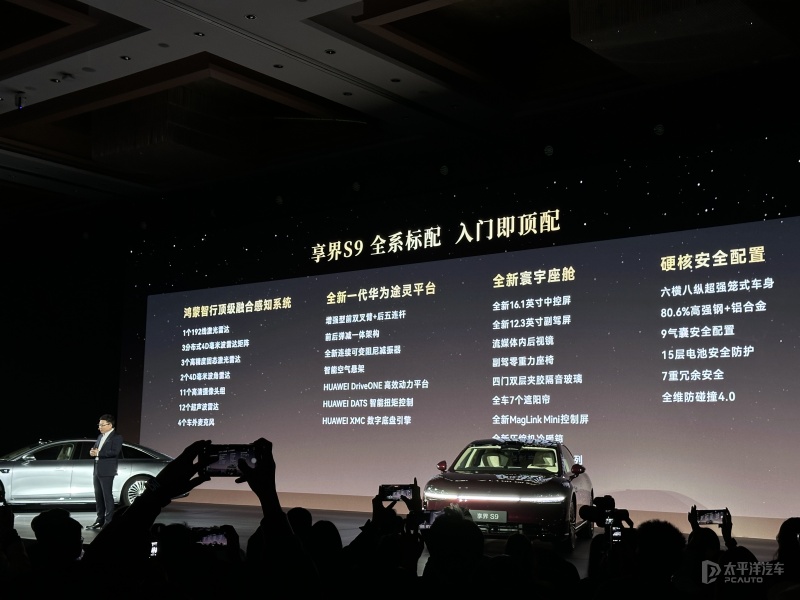首先在智能座舱方面,享界S9系列搭载最新华为鸿蒙座舱,不仅支持5G网络、四区域语音识别唤醒、面部识别、声纹识别、隐私声盾、应用商店、多指飞屏操控等基础功能,还可以实现车内对外喊话、窄车位手势召唤泊出、隔空抓取投屏等,且配有星闪数字车钥匙和超级桌面2.0手机车机无缝衔接,哨兵模式也得到了增强,进一步提升整车安全性。